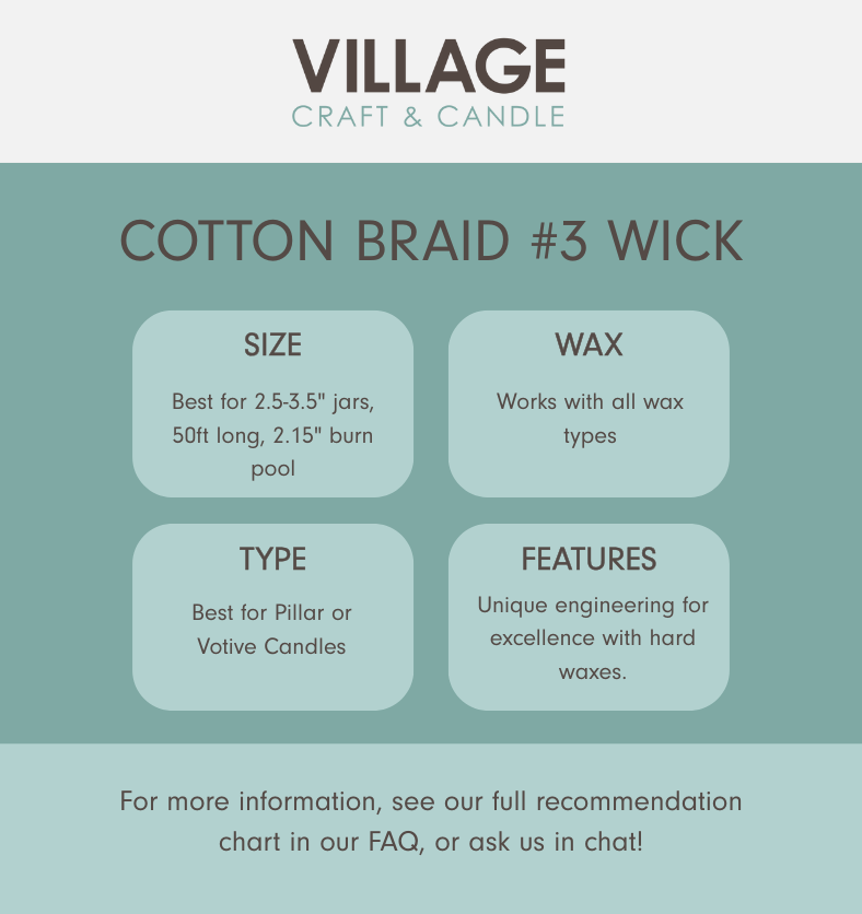 Remarque : Consultez notre article de ressources sur le choix de la bonne mèche. Nous ne pouvons garantir qu'une certaine mèche fonctionnera dans votre application, car de nombreux facteurs sont impliqués. Vous devez tester la combustion de vos bougies pour déterminer la meilleure mèche pour votre combinaison de taille de contenant, type de cire, huile parfumée et colorant. Veuillez utiliser nos kits d'exploration de mèches pour vous aider à trouver la mèche optimale pour votre application.
